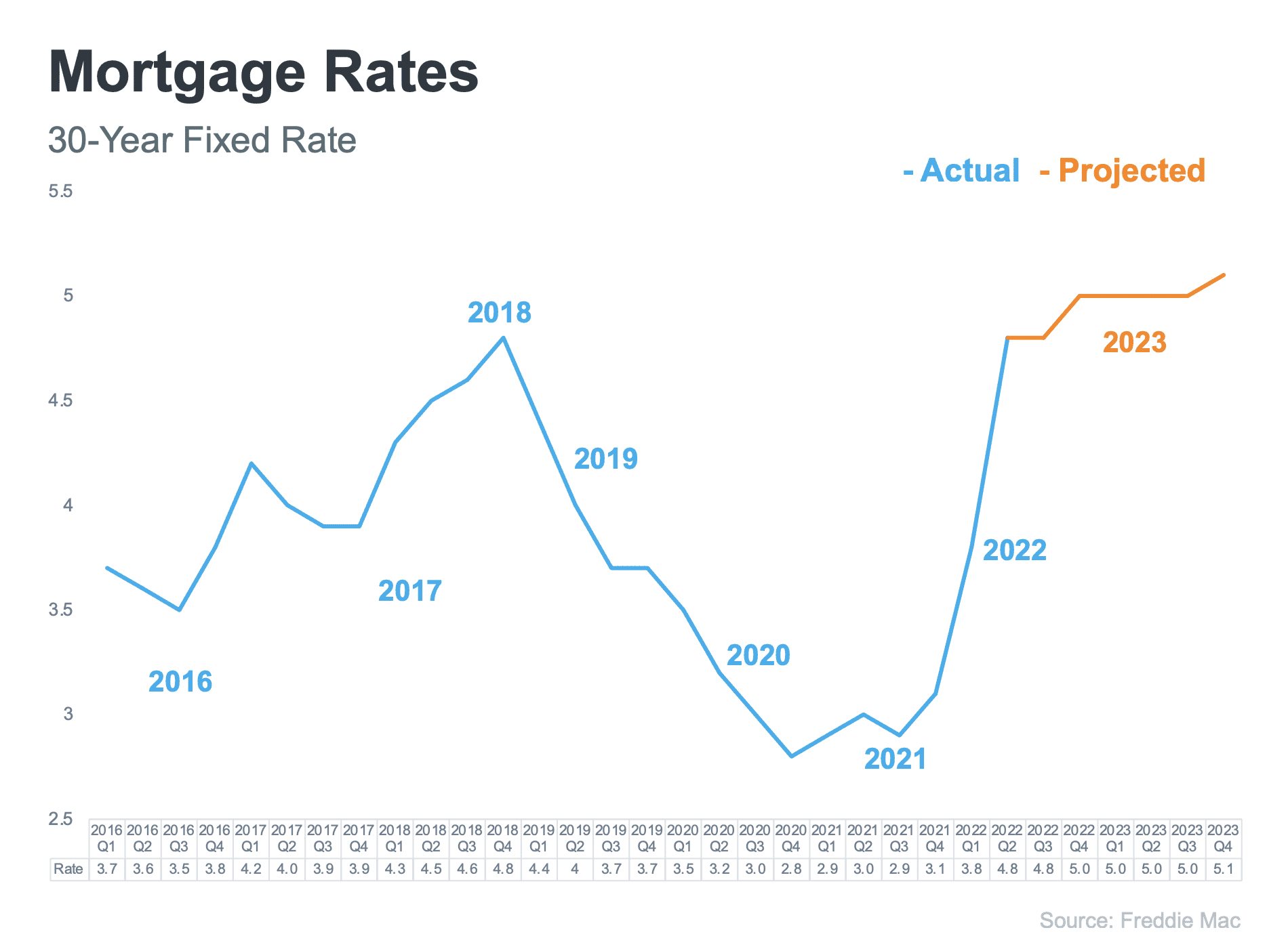 Mortgages are less likely to decrease in the future. Interest rates will keep on increasing over time. This suggests that the current mortgage interest rates are the lowest ones compared to the projected rates in the future.